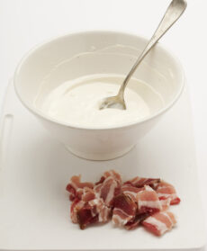 Tagliate la pancetta affumicata a pezzetti. Mettete la robiola in una ciotola, stemperatela con una forchetta e aggiungete lo yogurt, un pizzico di sale, uno di pepe e 1 cucchiaio di olio.