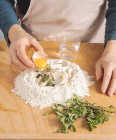 Fate fondere 25 g di burro, mescolatelo con 1 cucchiaio di foglioline di maggiorana e lasciate raffreddare. Miscelate le farine con 1 pizzico di sale, disponetele a fontana e mettete al centro il burro aromatizzato e il restante a cubetti ben freddo. Aggiungete il tuorlo e 70 ml di acqua fredda, incorporandola a poco a poco, fino a ottenere un panetto omogeneo. Avvolgetelo nella pellicola e mettetelo in frigo per almeno 1 ora. Mettete le mandorle a bagno in acqua. Stendete la pasta a uno spessore di 2,5 mm.
