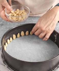 Rivestite uno stampo con il fondo amovibile di 28 cm di diametro con carta da forno bagnata e strizzata, imburratela bene lungo il bordo e allineatevi le mandorle scolate. Disponetevi la frolla coprendo anche il bordo, bucherellate il fondo, proteggetela con un foglio di alluminio e riempite con legumi secchi: infornate a 200° per 15 minuti, poi svuotate il guscio di pasta e lasciatelo intiepidire.