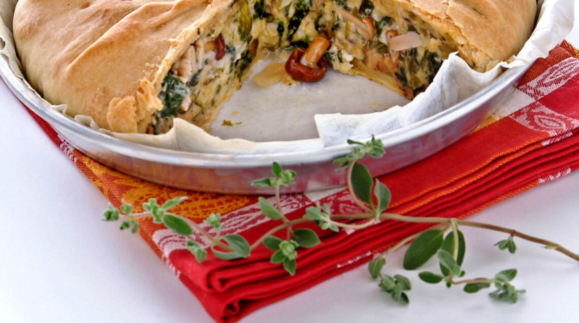4) Dividi la pasta in 3 panetti, tirali in 3 sfoglie sottilissime, disponile in uno stampo di 24 cm, bucherella il fondo e versateci il composto di funghi. Ripiega la pasta verso il centro in modo da chiudere completamente la torta, cuocila nella parte bassa del forno a 200° per circa 40 minuti e servila tiepida.