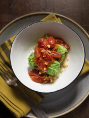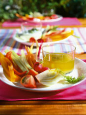 2) Lava e monda tutte le verdure; taglia i pomodori e le zucchine a fette dello spessore di circa 1/2 cm, la melanzana a dadi, la cipolla a spicchietti e i peperoni a tocchetti.