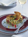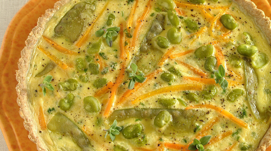 5) Completa la quiche. Trita lo scalogno spellato e rosolalo con l'olio rimasto in una padella. Unisci le verdure e saltale per 2-3 minuti. Sala e aggiungi maggiorana e prezzemolo tritati.