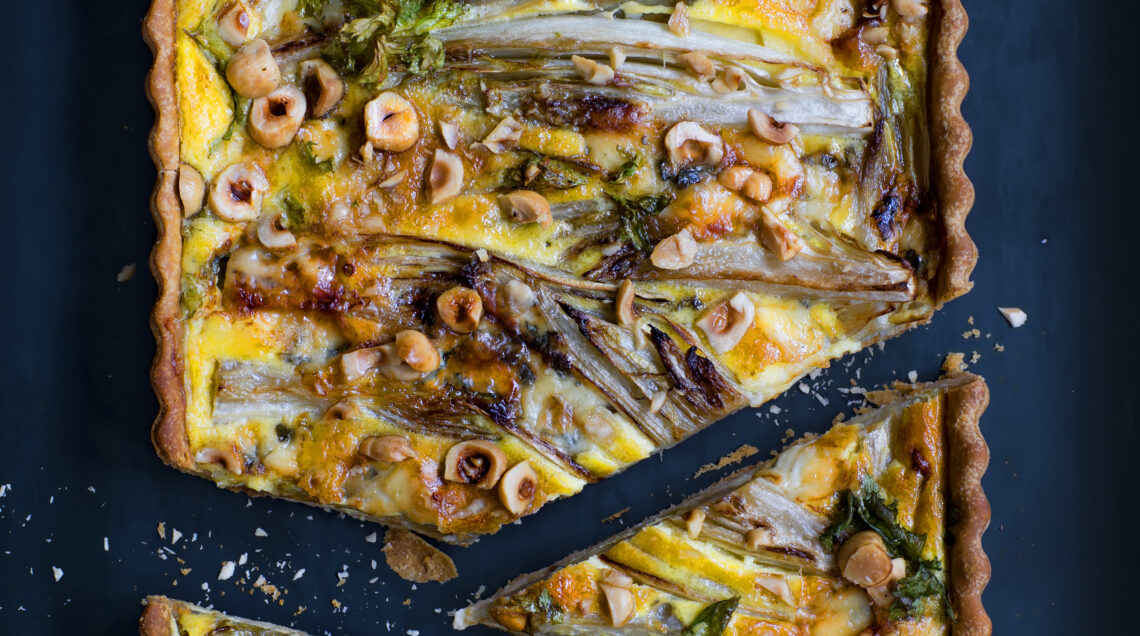 La nostra torta salata è una variante della ricetta classica, che mantiene lo stesso guscio di brisée, le uova e la panna per la farcitura, ma sceglie ingredienti di stagione per una farcia di carattare: indivia belga, Roquefort e nocciole.