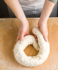 Arrotolate la pasta e richiudetela ad anello. Sistemate il tortano su una placca foderata con carta da forno, spennellatelo con poco olio e cuocetelo in forno caldo a 180° per 1 ora.