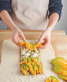 Private i fiori di zucca di gambo e pistilli. Stendete l'impasto in una sfoglia rettangolare sottile e farcitela nella parte centrale alternando prosciutto, zucchine, formaggio, fiori di zucca, asparagi, grana e timo: condite gli strati di verdura con olio, sale e pepe. Incidete le ali laterali della pasta in strisce di 2 cm di spessore.