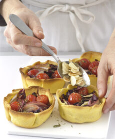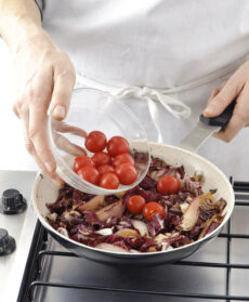 Nella preparazione della ricetta canestrini con le verdure, è importante che il ripieno sia gustoso e saporito. Taglia lo scalogno e il cespo di radicchio a fettine sottili e fallii saltare in una padella antiaderente con un filo d’olio. Aggiungi un pizzico di sale e di pepe. Quando le verdure saranno a metà cottura, unisci 8 pomodorini ciliegia interi incisi alla base.