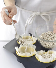 All’interno di ogni canestrino metti un foglio di carta da forno e dei fagioli secchi, che lo aiuteranno a mantenere la forma desiderata per tutto il tempo della cottura. Cuoci in forno già caldo a 180° per 15-20 minuti.