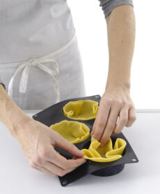 Tagliala in dischi di 10 cm di diametro e fodera degli stampini dai bordi dritti alti 3 o 4 cm, lasciando che la pasta sbordi di circa 1 cm. Aiuta i bordi a restare dritti facendo delle piccole pieghe.