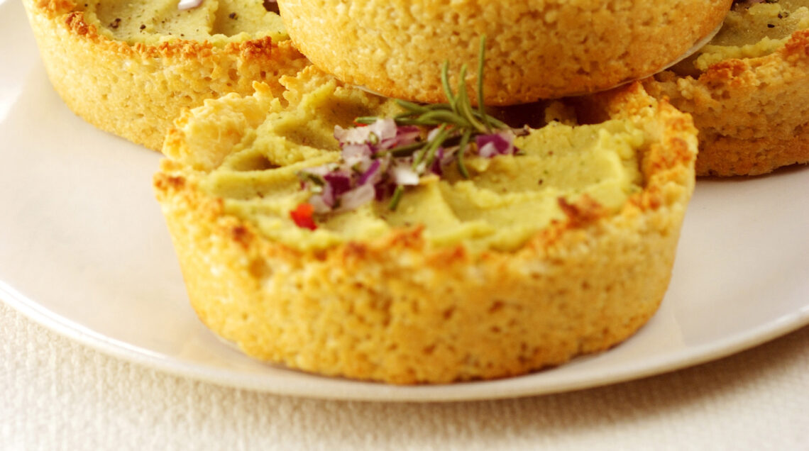 6) Sforma le tartellette con crema di ceci, farciscile con la crema di ceci e guarniscile con la cipolla tritata, il rosmarino ed il peperoncino rimasti. Servi tiepide.