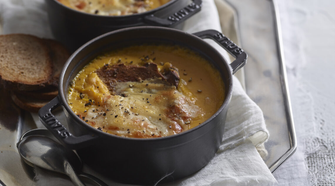 3) Tagliate il pane a fettine sottili e tostatele sotto il grill del forno finché sono dorate. Suddividete la zuppa in 4 pirofile da porzione alternandola alle fette di pane, cospargete con il Grana Padano Dop rimasto a scagliette e fate gratinare sotto il grill del forno fino a che il formaggio inizia a dorare. Completate con una macinata di pepe.