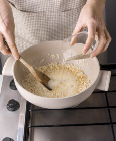 Il tartufo bianco rende raffinato questo semplice risotto preparato con Carnaroli, impreziosito dallo Champagne e cotto con brodo di carne o di verdura
