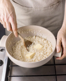 Fate fondere in una casseruola una grossa noce di burro e tostatevi il riso Carnaroli; bagnatelo con un bicchiere di Champagne (potete sostituirlo con un ottimo spumante), aggiungendolo gradatamente e facendolo man mano sfumare.