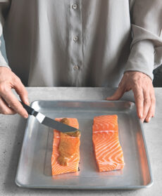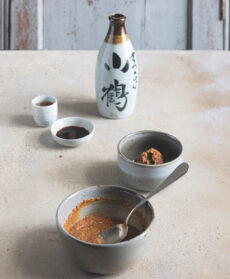 Eliminate le lische dal salmone. Mescolate il miso con il sake, il vermouth e la soia.