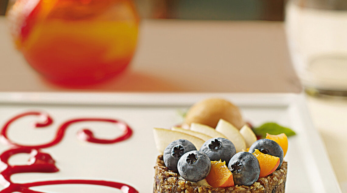 1) Prepara la crema. Metti a bagno gli anacardi per una notte, sgocciolali e frullali con 40 g di acqua, 20 g di succo di limone, 40 g di sciroppo d’agave, le prugne secche, i semi della vaniglia e la scorza di limone grattugiata.