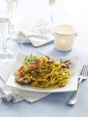 Arrosto di salmone e nasello all’arancia con cavolini alla melagrana