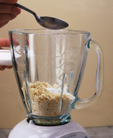 Trasferite 500 g di mandorle nel recipiente del mixer e frullatele a intermittenza e a bassa velocità in modo da non scaldare troppo le lame, unendo man mano lo zucchero.