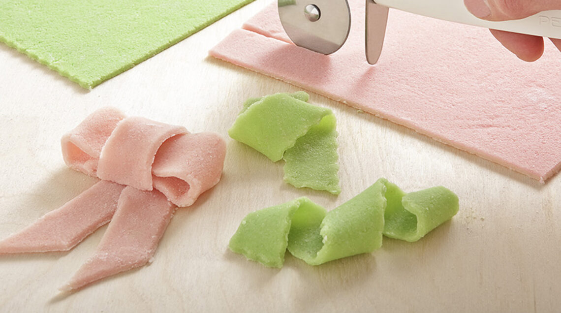Appiattite le porzioni di marzapane con le mani, spolverizzatele con poco zucchero a velo per evitare che il marzapane rimanga appiccicato al piano lavoro e stendetele con il matterello allo spessore di circa mezzo cm. Modellate la pasta a mano nella forma preferita o con delle formine tagliapasta passate prima nello zucchero a velo.
