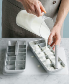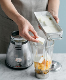 Preparate la base del gelato come indicato. Suddividete il composto in stampi per cubetti di ghiaccio e metteteli in freezer per 2-3 ore. Tagliate a pezzetti la frutta e fatela congelare (in alternativa potete usare quella surgelata).