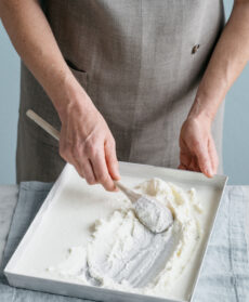 Preparate la base del gelato. Amalgamate lo yogurt (naturale, alla frutta, intero, scremato) con latte e zucchero, a cui potete aggiungere panna, già montata per dare leggerezza, o mascarpone. Trasferite il composto in un contenitore, meglio una placca bassa in alluminio, e mettete in freezer per circa 3 ore.