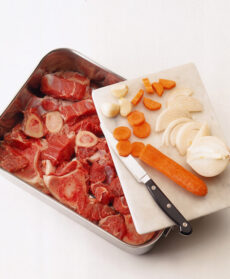 Mettete stinco di vitello, ossi e spalla tagliata a pezzetti a pezzetti in una teglia con la carota e la cipolla e infornate a 250° finché prendono colore (circa 15 minuti).