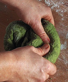 Per realizzare la sfoglia colorata, l'iter da seguire è quello della pasta all'uovo, preparata con farina, uova, acqua, sale e, a piacere, un po' di olio utile a renderla più malleabile durante la lavorazione. In più, rispetto a quella classica, si aggiunge assieme alle uova e alla farina l'ingrediente naturale del colore scelto, che deve essere in polvere, liquido o sminuzzato molto fine nel frullatore, al setaccio o tritato a mano. In questo caso sono stati aggiunti gli spinaci per dare all'impasto il colore verde. Potete lavorare gli ingredienti a mano o con l'impastatrice, fino a ottenere una pasta morbida, liscia ed elastica.