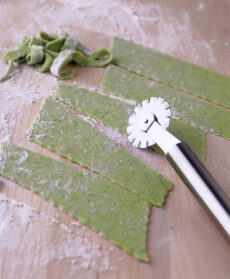 Stendete la sfoglia verde con il matterello e poi ritagliatela a piacere con una rotella dentellata.