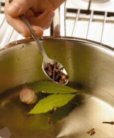 Aromatizzate un litro di aceto di vino bianco con chiodi di garofano, aglio e alloro. Salate, portate a ebollizione e tuffatevi 1 kg di peperoni tagliati a falde regolari.