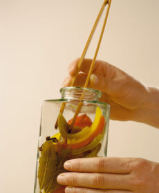 Man mano che riempite i vasetti, premete bene i peperoni aiutandovi con una pinza o un coltello: le bolle d'aria possono comprometterne la conservazione.