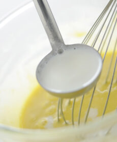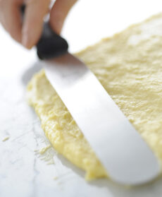 Il primo step è la preparazione della crema che deve cuocere qualche minuto in più rispetto alla ricetta originale per raggiungere una consistenza soda. Per evitare che possa bruciare, usate una pentola dal fondo spesso, tenete il fuoco al minimo e non smettere di mescolare. Ingredienti di prima qualità, assenza di grumi e aspetto vellutato ne fanno la giusta base. Se qualche grumo è rimasto, passate la crema al setaccio prima di stenderla. Una volta pronta, la pasticcera va versata in un’ampia teglia, foderata con carta forno o con pellicola trasparente. Se non avete la teglia, versatela direttamente sul piano di lavoro infarinato e datele la forma di un rettangolo. Livellate la superficie con una spatola o il dorso di un cucchiaio inumidito in modo da ottenere uno spessore di 2-3 cm. Quindi dimenticatela finché si raffredda completamente.
