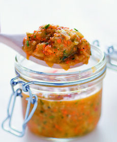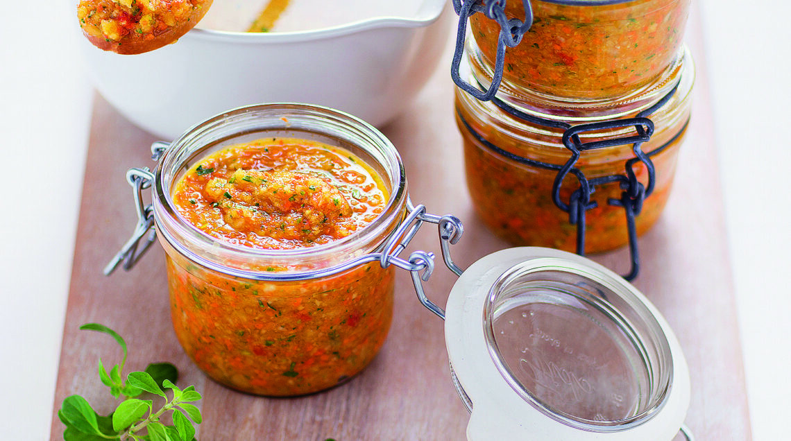 Riempite con il composto i vasetti, perfettamente lavati e asciugati, premendo bene con un cucchiaio di legno in modo da non lasciare spazi vuoti. Chiudeteli ermeticamente e riponeteli al buio in dispensa. Lasciate riposare il composto almeno per una decina di giorni prima di utilizzarlo. Conservatelo in frigo 3-4 giorni coprendolo a filo con olio.