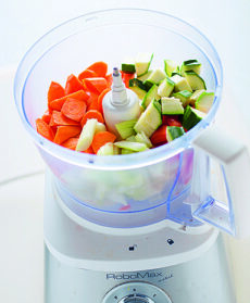 Sbucciate le cipolle, raschiate le carote, spuntate le zucchine e riducetele tutte a pezzetti; tagliate a tocchetti il sedano e i pomodori. Trasferite tutte le verdure nel mixer con il misto di erbe aromatiche, l'aglio sbucciato, 2 cucchiai di sale, 1 cucchiaio di olio, 3 cucchiai di vino e una generosa macinata di pepe.