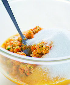 Trasferite il trito di verdure ed erbe aromatiche in una ciotola e unite il sale rimasto. Mescolate energicamente con un cucchiaio per amalgamare gli ingredienti e lasciate riposare per 10 minuti, in modo che il sale assorba tutta l'acqua rilasciata dalle verdure.