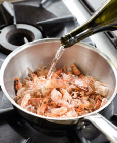 Lavate e tostate in una casseruola, con un filo d’olio, i gusci e le teste dei crostacei, a piacere con i ritagli di pesce, schiacciandoli bene con una forchetta per estrarre tutti i succhi. Sfumate con il vino e fate evaporare.
