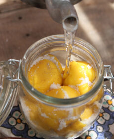 Portate a ebollizione un bricco di acqua, versatela sui limoni coprendoli completamente e chiudete il vaso ermeticamente. Fate riposare per un mese in un luogo fresco e buio agitando il barattolo ogni settimana.