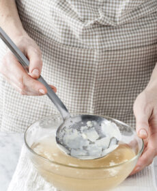 Se desiderate ottenere un brodo più leggero e limpido, magari da trasformare in trasparente gelatina, sgrassatelo così: con l'aiuto del mestolo forato passate alcuni cubetti di ghiaccio sulla sua superficie. Il grasso si solidificherà all'istante e risulterà molto facile eliminarlo.