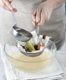 Passatelo quindi in un colino a maglie fitte, ancora meglio se foderato con garza o carta da cucina. Schiacciate leggermente le verdure e la carne con il dorso del mestolo per estrarne perfettamente i succhi e il sapore. Se il brodo non fosse abbastanza limpido ripetete l'operazione una seconda volta.