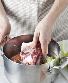 Scegliete una pentola capiente e a bordi alti che contenga comodamente gli ingredienti; coprite tutto con acqua ben fredda, portate a bollore con il coperchio e lasciate sobbollire a fuoco molto basso per qualche ora. Durante la cottura, se necessario, aggiungete alcuni mestolini di acqua bollente in modo da non fermare l'ebollizione e fare in modo che la carne rimanga sempre coperta.