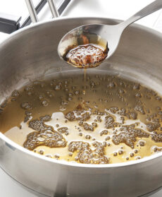 Man mano che cuoce, il caramello assumerà colori diversi: da biondo diventerà ambrato e infine scuro. Toglietelo dal fuoco quando sarà del colore e della consistenza desiderata e immergete il recipiente in acqua fredda per fermare la cottura. Il caramello ambrato è perfetto per il fondo di un crème caramel, quello biondo per caramellare la frutta e per creare decori e quello bruno per dare un tocco amarognolo a salse dolci o consommé.