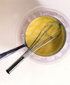 Immergete il pentolino, o la casseruola, in una ciotola piena di acqua e ghiaccio appena la togliete dal fuoco, poi mescolate con una piccola frusta a mano.