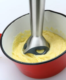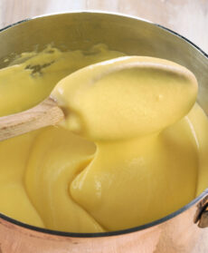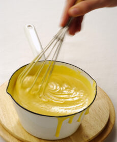 Il tegame più adatto è quello in rame o comunque un materiale che sia un ottimo conduttore di calore perché la temperatura dovrebbe rimanere costante. Attenzione però in cottura, il composto non dovrebbe superare gli 85°, altrimenti il sentore di uovo potrebbe essere troppo persistente e fastidioso. Se possibile, utilizzate un termometro da cucina.