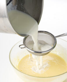 Attraverso un colino a maglie fitte, unite il latte bollente al mix di tuorli mescolando il tutto energicamente.