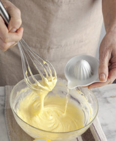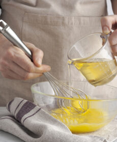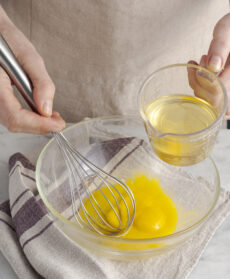 Disponete i tuorli a temperatura ambiente in una ciotola e iniziate a versate poco olio extravergine di oliva delicato, oppure olio di semi di mais (circa 2 cucchiai), goccia a goccia, montando con una frusta a mano o elettrica.