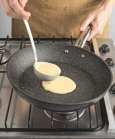 Scaldate una padella antiaderente, spennellatela di burro e versatevi un mestolino di pastella, prima sbattuta ancora per un istante.