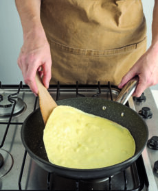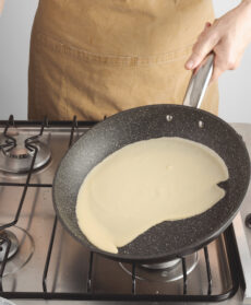 Fate ruotare velocemente la padella in modo che il fondo venga ricoperto da un velo sottile ma uniforme di pastella.