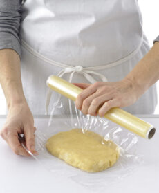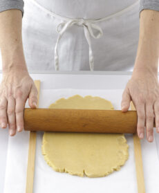 Appiattite la brisée con il matterello, direttamente su un foglio di carta da forno, allo spessore di circa 1/2 cm e ricavatene un rettangolo (per ottenere uno spessore uniforme potete sistemare lungo i lati lunghi del rettangolo due assicelle dello spessore indicato). Potete anche stendere la pasta in un disco, a seconda della ricetta da realizzare.