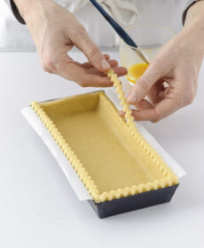 Trasferite la pasta con la carta in uno stampo rettangolare, o rotondo, facendola aderire anche ai bordi, tagliate quella che sborda e ricavate dai ritagli 4 strisce, o un'unica striscia per lo stampo rotondo, che potrete sagomare con una rotella tagliapasta smerlata; spennellate i bordi della pasta con un po' di uovo sbattuto, appoggiatevi le strisce, fatele aderire e spennellate anche queste.