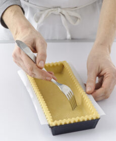 Punzecchiate il fondo della crostata, copritela con carta da forno e riempitela di fagioli secchi, o riso o sfere in ceramica da forno, poi passatela in forno già caldo a 180° per 15-20 minuti.
