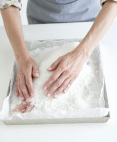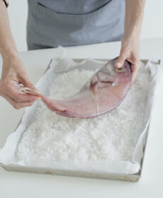 Il metodo più semplice per personalizzare questa tecnica è mescolare al sale erbe aromatiche tritate, grani di pepe o semi speziati come finocchio e anice, scorza grattugiata di limone, arancia o altri agrumi. Il sale al naturale resterà bianco, abbastanza “granuloso” e semplice da rompere, aggregandosi solo in parte grazie all’umidità rilasciata dagli alimenti e all’acqua residua del lavaggio del pesce. Se invece volete ottenere un guscio dorato, da rompere in tavola in modo scenografico, potete mescolare il sale (“liscio” o aromatizzato) con acqua o albume, come nella tecnica che segue: circa un bicchiere d’acqua e un paio di albumi ogni 2 chili di sale. L’impasto si prepara in una terrina, se ne stende circa un terzo sul fondo di una pirofila che contenga la preparazione a misura, si adagia il pesce e si copre con il composto di sale rimasto. Questa crosta compatta è meno “pervasiva” del sale al naturale e quindi adatta agli alimenti più delicati.