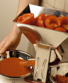 Lavate i pomodori, asciugateli e tagliateli a metà; strizzateli delicatamente per eliminare i semi e passateli pochi alla volta in un passaverdure, raccogliendo la passata in una ciotola.