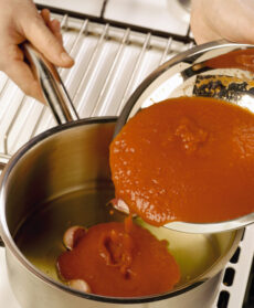 Potete fare il soffritto se preferite una salsa più intensa o saltare completamente questo passaggio per una salsa più leggera. Un pizzico di zucchero serve a bilanciare l'acidità del pomodoro.